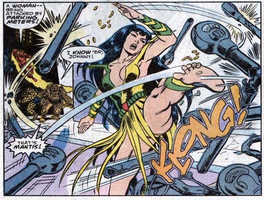 Kang’s ship appears in New York. He attacks the FF, hitting them with a paralysis ray. He abducts Mantis and leaves a bomb behind. Ben, with the increased strength that came with his new mutation, throws the bomb into orbit, where it explodes without harming anyone. Aboard Kang’s ship, Mantis explains she no longer has her Celestial Madonna powers, but Kang says he’ll keep her trapped aboard his ship anyway.