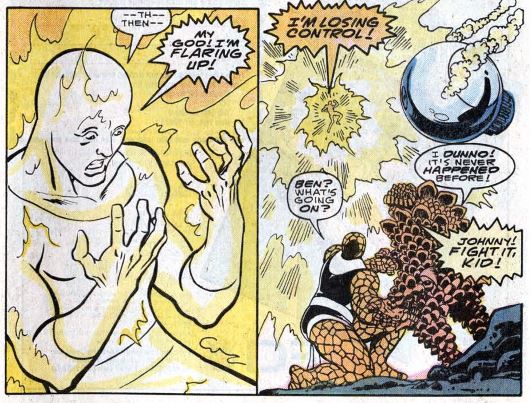 The FF board a Fantasticar and pursue Kang’s ship. Outside of New York, Johnny’s flame is under control again. The strange figure who was spying on Aron is now secretly following the FF. Kang’s ship arrives at Diablo Mountain in front of a giant door he calls “the Door of the Dreaming Celestial.” The FF fight Diablo’s ship, not making much of a dent in its defenses. Johnny loses control of powers again, causing a huge explosion. This doesn’t damage the ship, but it sends Johnny falling off into the distance. Aboard the ship, Kang gloats about his victory, but then turns to see Mantis has disappeared.