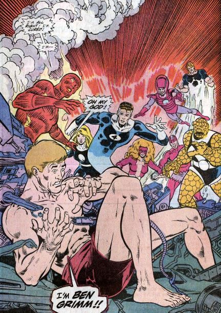 Everybody fights, with Reed warning them the whole time not to interrupt Johnny’s procedure. The two teams seem evenly matched, until Klaw and Titania team up against Ben, throwing him into the machine curing Johnny. The machine falls apart, and in the wreckage we see that Johnny is cured and Ben is… human again!