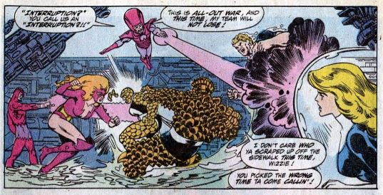 Everybody fights, with Reed warning them the whole time not to interrupt Johnny’s procedure. The two teams seem evenly matched, until Klaw and Titania team up against Ben, throwing him into the machine curing Johnny. The machine falls apart, and in the wreckage we see that Johnny is cured and Ben is… human again!