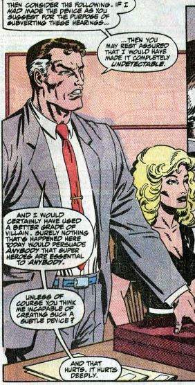 Reed then produces a device of his own, which scans the genotypes of everyone in the room, to show whether someone is a mutant, or at least has the potential for superhuman abilities. Two members of the committee (we’re not told which two) have more-than-human genotypes. Reed not-so-subtly threatens to release this information to the public, and then the committee votes to indefinitely table the superhero registration bill. (This is blackmail, right? Reed just went and blackmailed the government?)