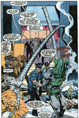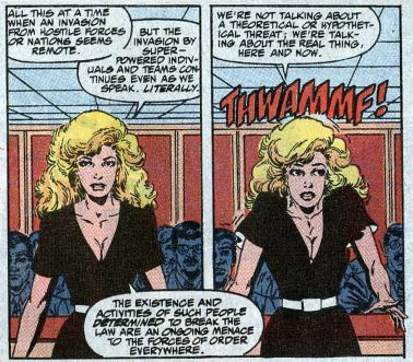 Our heroes are in Washington D.C., where Reed is testifying against the government’s proposed superhuman registration. (This group is “the committee” and several characters are identified as “congressmen” but that’s as specific as it gets.) The meeting keeps getting interrupted by bumbling C-list villains who are attacking the FF as part of the Acts of Vengeance event, in which all the villains are working together to fight heroes they don’t normally fight. As this issue begins, a Representative Pertierra accuses the FF of secretly orchestrating the villain attacks just to make their point. Reed dismisses this argument, saying that if were to send supervillains to attack Washington, it’d be “a better class of villain,” which is a rare glimpse into Reed’s dark side.
