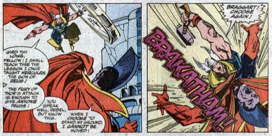 On the planet, we see Gladiator, the Superman-like head of the Shi’ar’s Imperial Guard, taking notice of the disappearing equipment, he breaks through to the heroes’ time dilation and immediately picks a fight with Thor. (There’s no mention of time travel in this part, so I guess Gladiator doesn’t age, and this is him in the distant future.) Thor and Gladiator are evenly matched, with Thor getting knocked around by Gladiator, and Gladiator being one of the few characters able to survive getting smacked in the face by Thor’s hammer. Sharon breaks up the fight, reminding the two that they’re fighting around dangerous weaponry.