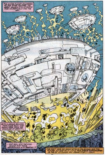 The heroes find themselves surrounded by battleships in orbit around the Shi’ar planet. Because of the time dilation (or something) it appears that the whole planet is frozen in time. The FF and co. visit a weapons manufacturing plant and just help themselves to what they need.