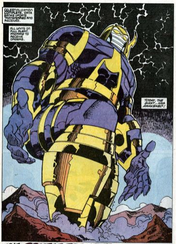 Thanks to Reed’s universal translator, Gladiator remembers that these are the good guys. He reveals that he is currently acting as regent of the Shi’ar, in place of the empire’s child emperor, Charles I. Gladiator orders the entire Shi’ar fleet to attack the Galactus device, even at the risk of leaving the Shi’ar homeworld defenseless. The fleet attacks Galactus, and Reed is in awe of the spectacle. The battle is felt all the way back in the present, where we revisit the mountain of the Dreaming Celestial (from back in issue #323) where the Dreaming Celestial, a robot who is so big he makes the mountains look all tiny, finally awakes and now walks the Earth.