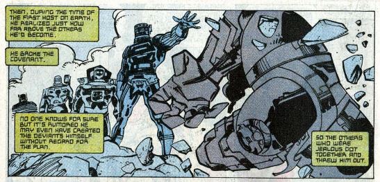 Thor stays behind while the rest of the heroes break into the mountain and explore the high-tech complex inside it. There’s a few pages of fighting where the heroes are attacked by alien deviants who live there, to protect the Celestial. When them gone, Reed and Sue access the mountain’s computer, and get an even longer history of the Dreaming Celestial. He was once the greatest of all Celestials, but he broke their laws and was sealed inside the mountain to sleep forever, dreaming of revenge. While sleeping, the Dreaming Celestial somehow engineered this whole Galactus-devours-the-universe plot, just so the Dreaming Celestial can rule the new universe that will rise in our universe’s place.