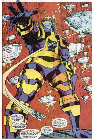 The FF, Thor and Iron Man have traveled to the future, where Galactus has built a giant device to let him devour the entire universe. Our heroes have convinced the Shi’ar Empire to send its entire fleet to attack Galactus. On Earth (future Earth, even though the previous issue made it sound like present-day Earth) the Dreaming Celestial has awakened from under his mountain and walks the Earth. Except he doesn’t hang out on Earth for long, because he immediately teleports onto the surface of Galactus’ device. Why is a Celestial a big deal? This one waves his hand through the air and doing so destroys the entire Shi’ar fleet.