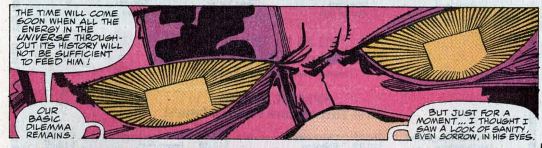 Reed confronts the Celestial, threatening to go back in time and tell the other Celestials of his plan while the Celestial sleeps. The Dreaming Celestial won’t have this, and chases our heroes through time. Reed outsmarts the Celestial by bringing him straight back to Galactus’ device, where Galactus devours the celestial. With his hunger temporarily sated, Galactus looks at Reed for a second with a sense of sorrow in his eyes. Then he goes back to devouring the universe. Reed says he has an idea on how to stop Galactus, adding that it is, “nothing short of insane!”