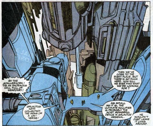 The heroes find Galactus’ weapons vault, another mind-bogglingly huge space containing weapons from all over the universe. (Why does the godlike Galactus even need a weapons vault? We’ve never seen him take trophies from planets he’s destroyed.) Ben tries a light switch, only to find it broken. From this, Reed deduces that the Ultimate Nullifier would be hidden in plain sight, and it is behind the broken light switch. (Why is there a human-sized light switch in an alien space fortress? Why does a room bigger than a planet operate its lighting on a single switch? I’m really over-thinking all this, aren’t I?)