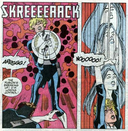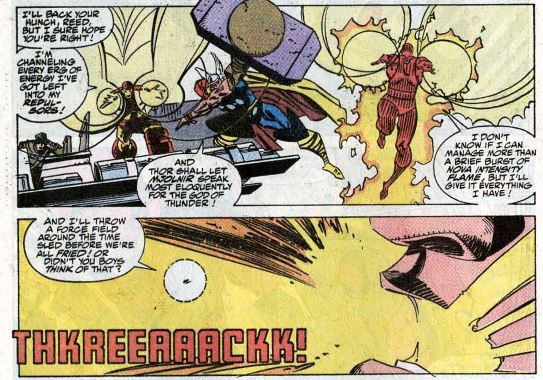 The heroes exit the time bubble and reenter the time stream. They reencounter Nebula, who is floating around in the time stream, and try to save her. They’re too late, and she vanishes. The FF successfully arrive back in the present, in Four Freedoms Plaza. Thor and Iron Man don’t make it back, but Reed says because it’s time travel, they can go back for them later. (!) All seems well, but in the other room, a TV news report states that U.S. President Dan Quayle and Soviet Premiere Josef Stalin are at odds, and the world is on the verge of nuclear war.
