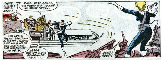Clobberin’ time: When Reed and Sue are reunited, Ben makes some sarcastic quips, but Sharon is there to point out that he’s just as glad Sue is still alive as anyone.