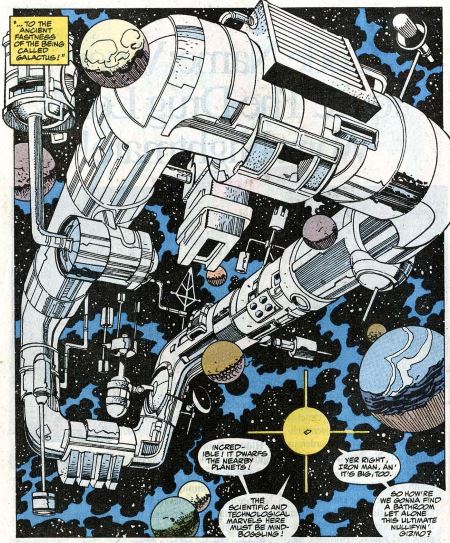 The heroes find Galactus’ weapons vault, another mind-bogglingly huge space containing weapons from all over the universe. (Why does the godlike Galactus even need a weapons vault? We’ve never seen him take trophies from planets he’s destroyed.) Ben tries a light switch, only to find it broken. From this, Reed deduces that the Ultimate Nullifier would be hidden in plain sight, and it is behind the broken light switch. (Why is there a human-sized light switch in an alien space fortress? Why does a room bigger than a planet operate its lighting on a single switch? I’m really over-thinking all this, aren’t I?)