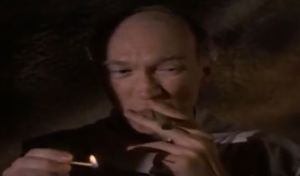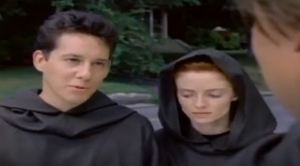 In the second episode, “The Poison Pen,” we’re diving deep into “religious horror” territory, I guess to further give this series its own identity outside of its slasher movie namesake. At an all-male religious sect (the script never uses the words “monastery” or “monks”) a man is using a cursed antique pen to predict/cause deaths in the future. To get the pen back, Ryan and Micki go undercover, with Micki unconvincingly disguised as a man.
