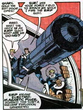 After a time travel adventure, our heroes have landed in an alternate timeline, where World War III has just broken out. U.S. President Dan Quayle and Soviet leader Josef Stalin have launched nukes, so the FF have armed themselves with ridiculously oversized cool guns to put an end to the conflict. The first couple of pages are the heroes using their cool guns to shoot down the nuclear missiles. The guns are equipped with EMP blasts, which disarm the nukes, letting them fall to the ground with exploding.