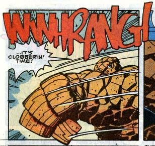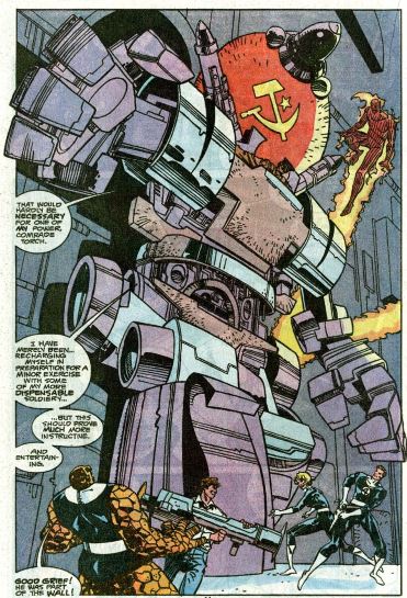 Reed contacts the White House and asks that the FF be given six to solve the crisis themselves. The Russians fire their nukes again, this time aiming for the FF’s plane. Sue turns the entire plane invisible and Ben flies it into Soviet space. The team sneak into Moscow inside a stereotypically Russian potato truck. They break into Soviet headquarters, fight some guards, and make their way into a huge science lab. There, they find Stalin wearing a King Kong-size exoskeleton. He is… the Supreme Soviet!