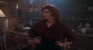 This week we’re dealing with a cursed lantern. Its light burns people to a crisp, and then it shows its owner, a fisherman named Jonah, where undersea treasure is buried. The episode begins where most end, in which Ryan and Jack get the lantern away from its owner in a life-or-death fight. Back at the store, Ryan and Jack leave for an astrologer’s conference (is that a thing?) and Micki is babysitting a friend’s kid, Richie, in the store. Jonah and an accomplice named Tom break into the store. They hold Micki and Richie hostage, demanding Micki return the lantern.