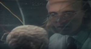 A scientist has a bona fide brain in a jar, which he has hooked up to a computer, allowing the two to communicate. He says the brain has developed a childlike intelligence and could be the key to creating A.I. Similarly, he’s working with a man named Henry, who only has a childlike IQ of 60. What’s more, the scientist owns an antique trephinator, a medical device that drains fluid directly out of the brain. This trephinator is equipped with two seats, the idea being that the fluid can be transferred from one brain to another. Henry uses the antique on the scientist, stealing all of the scientist’s intelligence, and then killing him.