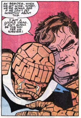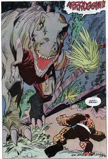 A tyrannosaurus attacks, so we get a couple of pages of fighting. Sharon tries to sacrifice herself to save Ben, only for Ben to rescue her. They have another heart-to-heart, where she says she’d rather be a living monster than a dead human. Ben promises to talk to Reed about a cure for Sharon when they get home.