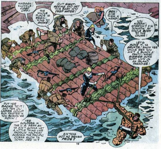 Clobberin’ time: One of the soldiers suggests that Ben enlist, but he says he’s too busy being a superhero. What’s not mentioned is that Ben was an Air Force pilot before his FF days.