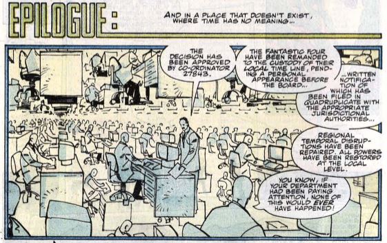 We end with a one-panel epilogue, depicting an office environment in a place “where time has no meaning.” This reveals that all this business with the island was the result of a bureaucratic error, and that the temporal disruptions have been repaired. This would appear be a one-off joke in the style of Douglas Adams, but it’s actually the first appearance of the Time Variance Authority, who will show up again in just a few issues, and who will later complicate life for the Avengers, She-Hulk, and even Deadpool.