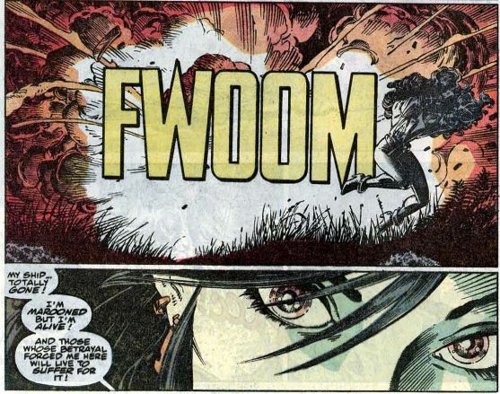 Art Adams temporarily takes over artwork duties from Walt Simonson, who is still scripting. Adams brings his trademark cartoony style to FF. We begin with a damaged spaceship crashing on Earth. An alien woman, whose face we don’t see, survives the crash and swears revenge on those who forced her to come to Earth.