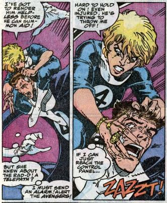 Out in space, a Skrull battleship is on the way to Earth. The Skrulls are in pursuit of a fugitive named De’Lila. Although not stated outright, it’s clear that De’Lila is the space woman from the opening scene. Back at HQ, De’Lila takes the shape of a beautiful woman to seduce/sneak her way past security. Using a stun device she wears as a ring, she works her way through the whole team. She shape-shifts as Nebula to stun Johnny. She shape-shifts as Alicia to stun Ben. She shape-shifts as Ben to stun Sharon, and she shape-shifts as Namor to stun Sue. Finally, she shape-shifts as Sue to stun Reed, but the stunner doesn’t work as well on Reed’s elastic form. They fight, until she succeeds in knocking him out.
