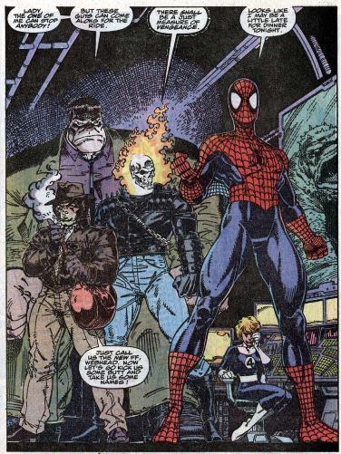 At HQ, De’Lila is still in the form of Sue, sees a news report about giant monsters on the move, and she knows this means her pursuers have come for her. She starts researching other Marvel heroes. Later, Spider-Man shows up, saying his spider-sense has somehow drawn him to FF HQ. He meets Wolverine and the Hulk outside the building. They have similarly been drawn there. A security guard meets them at the door, saying Sue (really De’Lila) had summoned four heroes, and wonders where the fourth is. On cue, Ghost Rider comes riding up.