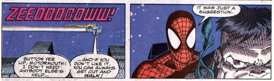 Fantastic fifth wheel: There are two schools of thought on the New Fantastic Four. One is that they’re a blatant cash grab. The other is that they’re a parody of a blatant cash grab. (This issue’s cover boasts “The world’s most commercialest comic magazine,” suggesting that Marvel is in on the joke.) The big question for this blog is whether the New FF means these four can now be considered alternate members of the Fantastic Four. It’s always been my opinion that the New FF is its own team, separate from the regular FF. Ben would agree, it seems, because in the Thing series from 2006, Spider-Man mentions the New FF, and Ben says, “You think that counts?”
