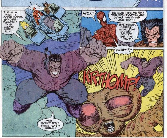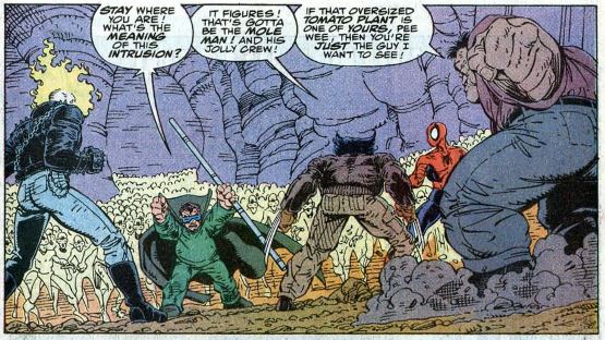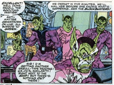 The Skrull captain tries to escape by shape-changing into the form of a rock, until the Hulk and Wolverine threaten to destroy all the rocks. Ghost Rider uses his penance stare (sweet!) on the captain, who reveals his crew is in search of some Skrull rebels who intend to assassinate the Skrull emperor.