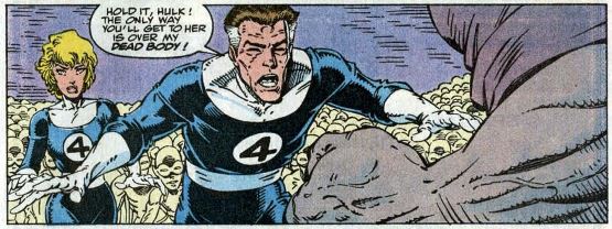 One of the Skrulls then notices Spider-Man’s scanner — the one De’Lila gave him — recognizing it as Skrull tech. Spidey and Skrull realize that Sue is really De’Lila in disguise. That’s when De’Lila and Reed show up. (Does this mean the cave in the Catskills leads directly to an island in the Bermuda Triangle? The comic doesn’t say.) Reed, still being mind-controlled, says the only way the New FF will get Sue is through his dead body. The Hulk, believing Reed is also a Skrull in disguise, answers, “It looks like you’re going to get your wish.”