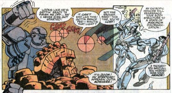 If you’re having trouble following the puzzle-like Reed and Doom story, you’re probably good, because it’s mostly the two of them throwing punches at each other. Reed at one point dons a suit of armor he finds to give him an edge in the fight. Reed finally deenergizes the time sequencer devices that allow them exist outside of time, bringing them back to the present. Somehow, this gives Reed the advantage, as he beats the crap out of Dr. Doom.