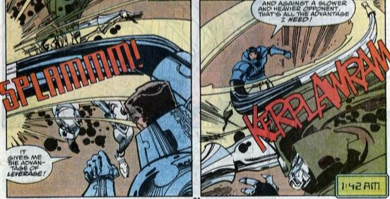 How to read this comic: Issue #352 has two stories being told simultaneously. The main FF story is read linearly, like any comic would be. The Doom vs. Reed fight, meanwhile, is non-linear. Each panel in their part of the story has a time stamp, and readers have to read them in order of the time stamps, regardless of what page they’re on.