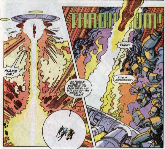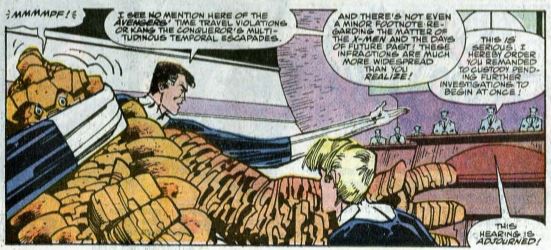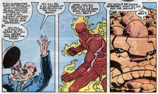 Ben and Johnny reach a power generator room (called a “power substation” a few pages later) where the Time Police reveal they’ve taken Sharon hostage. Ben is not going to play ball, so the Time Cops sweeten the deal. They offer to change time so that the FF’s original spaceflight never actually happened, and Ben can re-live his entire life as a human. Johnny doesn’t buy it, but Ben stays quiet, contemplating taking the deal.
