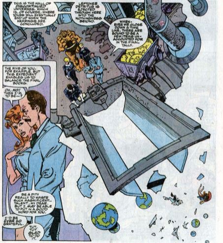 Trivia time: Look closely. The Hall of Discontinued Universes contains two familiar characters. One appears to be Alex Power of Power Pack after he was transformed into an alien. The Power Pack comic was cancelled before that storyline could be resolved. (Turns out the alien Alex was actually an Alex clone.) The other figure is Supergirl, who was written out of continuity in DC’s Crisis on Infinite Earths. Supergirl later came back as the Matrix alien in the ‘90s, and then the original was finally reintroduced in the early 2000s.