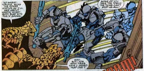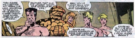 The train then reenters the FF’s universe. Casey reveals that the “goods” to pay for the trip are the FF’s uniforms, which he intends to turn into railroad worker uniforms. So the FF strip down to their undies and return to Four Freedoms Plaza. We see that Ben has mutated from his spikey form back to his classic rocky form. As he and Johnny banter, Reed comments that everything’s back to normal.