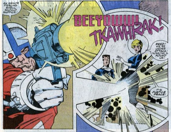 Fade out: The comic would have us believe that Sue and Reed cannot be seen inside her “sphere of invisibility,” even though that’s not how her powers work. A few pages later, Justice Peace is able to spot them, revealing that they’re not invisible after all.