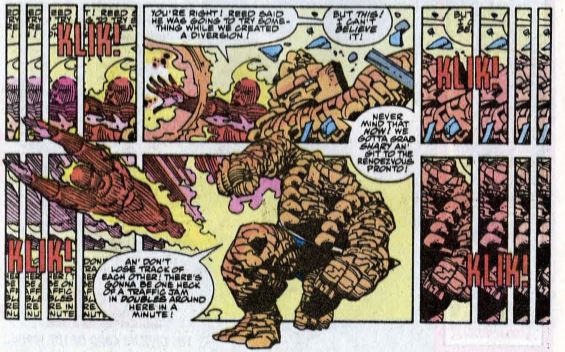 Clobberin’ time: Absolutely no reason is given as to why Ben reverts from his spikey form to his more-familiar rocky form, except to say, “somebody up there just likes me better like this.” This is a not-so-subtle jab at Marvel editorial’s efforts to undo all the big changes of the last hundred issues or more and get back to Silver Age Fantastic Four.