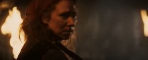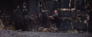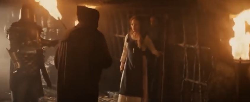 Then there’s the first exterior shot of the movie, as Ethna walks outside the castle gate as black-cloaked soldiers ride horses by. To the left of the screen, we see the castle walls are made up of huge bricks, each one a couple of feet tall, held together with pale yellow clay and straw. This gives the feeling that this castle is gigantic. Even though this is a pretty dark, dreary opening scene, the score adds a heavenly chorus to this shot, adding a sense of hope and wonder to what’s happening.