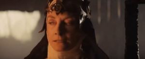 Ethna not-very-sneakily sneaks down a corridor, only for a guard to shout “Stand aside for Queen Bavmorda,” just as our villain appears at the far end of the hall. Bavmorda, who appears to be walking with a slight limp, moves past the midwife, not paying her any attention. Sorsha and more druids follow her.