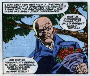 Cut to the Puppet Master, who is standing by his wife’s grave, speechifying about how he can tell something is wrong with Alicia, and how her personality has seemingly changed since she married the Human Torch. He says these are things that only a parent can notice. He swears to solve the mystery.