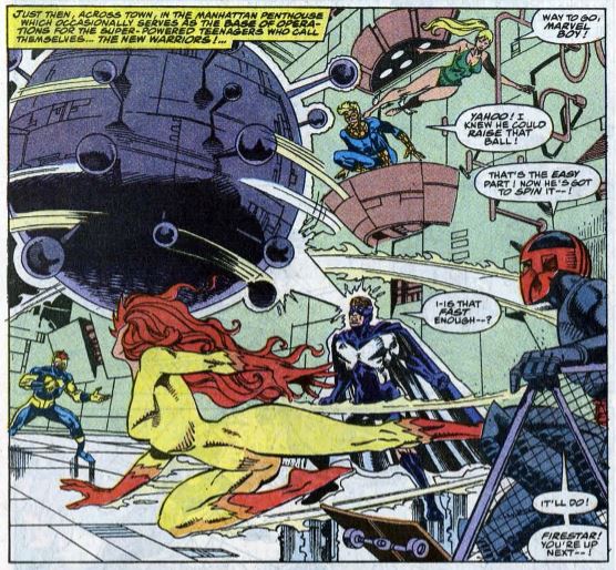 Then this ‘60s-style comic takes a left turn into the ‘90s, as we visit the New Warriors, who were Marvel’s hot property of the moment. But is the ‘60s throwback version of them. They’re in their version of the X-Men’s Danger Room, getting their own excuse-for-the-characters-to-show-off-their-powers-for-a-few-pages thing. The New Warriors consist of Firestar, Nova, Marvel Boy, Namorita, Speedball, and the super-skateboarding Night Thrasher. Marvel Boy gets a telepathic flash warning him of danger. While the others remind him that he’s not telepathic, Marvel Boy flies off. The rest of the team follows him.