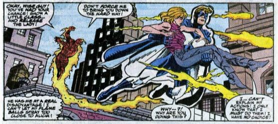 The New Warriors see Johnny chasing Marvel Boy, so they attack Johnny. He signals the rest of the FF, who are quick to show up in a Fantasticar. Everybody fights! Firestar is no match for Johnny, but Namorita manages to punch him in the face. Nova smacks right into Sue’s force field. Reed tries to stretch himself around Speedball, but he can’t contain Speedball’s non-stop bouncing kinetic energy. Speedball escapes Reed, and that same kinetic energy sends Ben flying through the air.