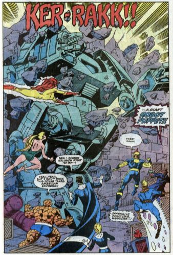 Marvel Boy delivers Alicia to the Puppet Master, just before overcoming Puppet Master’s mind control and flying off. Alicia (Lyja) doesn’t recognize Puppet Master, and he exclaims “The truth is so obvious!” The FF and the New Warriors very quickly set aside their differences and charge the Puppet Master, but he has a contingency plan. He pulls out a tiny robot puppet, which controls a gigantic robot conveniently hidden nearby. The two super-teams make short work of the robot, smashing it up real good. This, however, gives Puppet Master time to escape. (You’d think Reed and/or Night Thrasher would have scanning equipment and whatnot to search for Puppet Master, but the attitude instead is “Oh well, he got away.”)