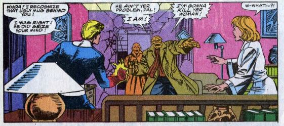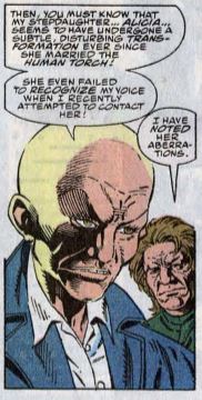 We then visit the Vault, a special prison in Colorado built for superhuman criminals — basically Marvel’s equivalent of Arkham Asylum. There, the Mad Thinker is locked up. Except not really, because he mentally projects his consciousness into an artificial body of his, located in his secret Manhattan lab. There, he can conduct crimes with a perfect alibi. He meets with the Puppet Master, who says he desperate for help. Puppet Master says his daughter Alicia has undergone a “transformation” since marrying Johnny. Mad Thinker says the solution is to destroy the FF, but then his computers announce that the FF are already as good as dead.