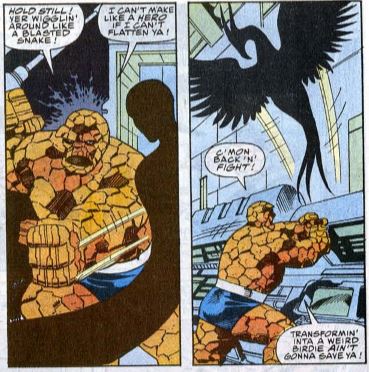 There’s a short scene with the Puppet Master reviewing the Mad Thinker’s findings, saying, “They can’t be true! And yet… they explain everything!” Back at FF HQ, Ben is making a late-night sandwich when he hears noise coming from Reed’s lab. He finds a stranger in there, whom we only see in silhouette. The stranger is able to shape-shift into a bird-like form and then a snake-like form before escaping from Ben. The rest of the FF can’t find any sign of an intruder, with Johnny and Franklin joking that Ben might have dreamed the whole thing. Reed, however, believes the answer lies in his brain-patternizer device.