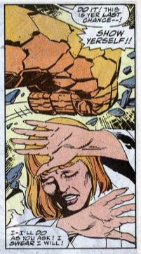 Ben and Johnny fight while Alicia/Lyja flees. Sue wants to stop Ben, thinking he’s being mind-controlled by Puppet Master, but Reed stops her, saying the brain-patternizer has found something startling. Alicia/Lyja makes it the FF’s hanger bay, with Ben and Johnny fighting all around her. Ben finally confronts Alicia/Lyja, punching the wall around her, demoing, “This is your last chance! Show yourself!”