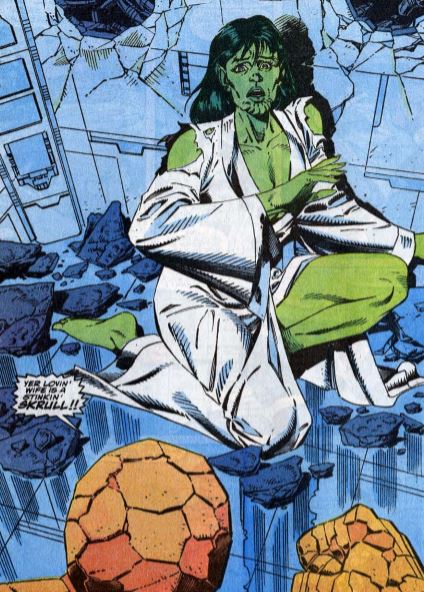 The issue begins with Reed in his lab, just having invented a “brain-patternizer.” He says this device will protect the FF from mind-controlling villains such as the Puppet Master. Our heroes testing out this device makes for a pretty weak excuse-for-the-characters-to-show-off-their-powers-for-a-few-pages thing. Alicia (who, as we’re about to learn, is secretly Lyja the Skrull in disguise) walks into the lab, and she refuses to be hooked up to the machine.
