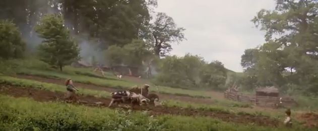 The kids, as we’re about to learn, are Ranon and Mims. Ranon runs off, crying “Dada! Dada!” Mims just stands there quietly. She’s holding a doll, and she makes the hands click together as if it’s applauding. We cut to our hero, Willow Ufgood, working a field at his farm. There is a pig pulling the equipment, in place of horses or oxen. The comic adaptation has several references to him seeding the field, but in this scene he’s quite obviously plowing it. In the background we can see some more animals and a penned off area, and what looks like a small windmill, for some of that clever pre-industrial tech. Ranon says they’ve found something in the river (he doesn’t say what) and Willow insists that he’s working and can’t play right now. Ranon insists. While smiles, and gives in. This shows right away that he’s a good-natured family-man type.