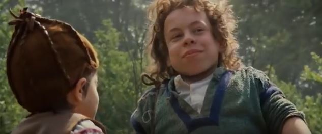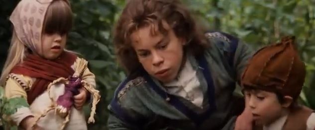 The kids are enamored by the baby with a typical “Can we keep it?” but Willow somehow knows this is trouble. He suggests pushing the baby farther downstream and forgetting they ever saw it, which seems awfully harsh for the guy we just saw being a playful dad. A voice in the background shouts “Ufgood! Willow Ufgood!” This is a nice detail letting us know our hero’s name. (I hate fantasy/sci-fi movies that never say the main characters’ names.) Willow says “It’s the prefect,” and we get that this means trouble. He tells the kids to keep the baby quiet and not to touch it. (Not sure how they can do that.) He hurries back to the field, while the kids turn their attention back to the baby.