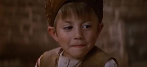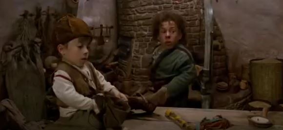 While this dialogue has been going on, young Ranon has a bit of business to the left of the screen, where he climbs up onto the kitchen table and starts pulling stuff out of a small black bag. First he pulls out a necklace, and then some feathers. I have no idea what this is about. Is Willow doing magic without realizing it, making stuff appear in the bag, and no one but Ranon notices it? Or is Ranon just being a mischievous kid? They give him a close-up where he has a real devious look on his face.
